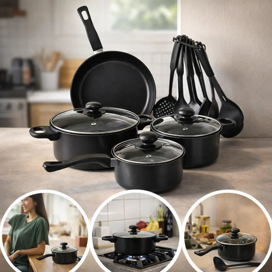 ОГРАНИЧЕНИ КОЛИЧИНИСет од 13 парчиња тенџериња, тави и кујнски прибор со нелеплива површина