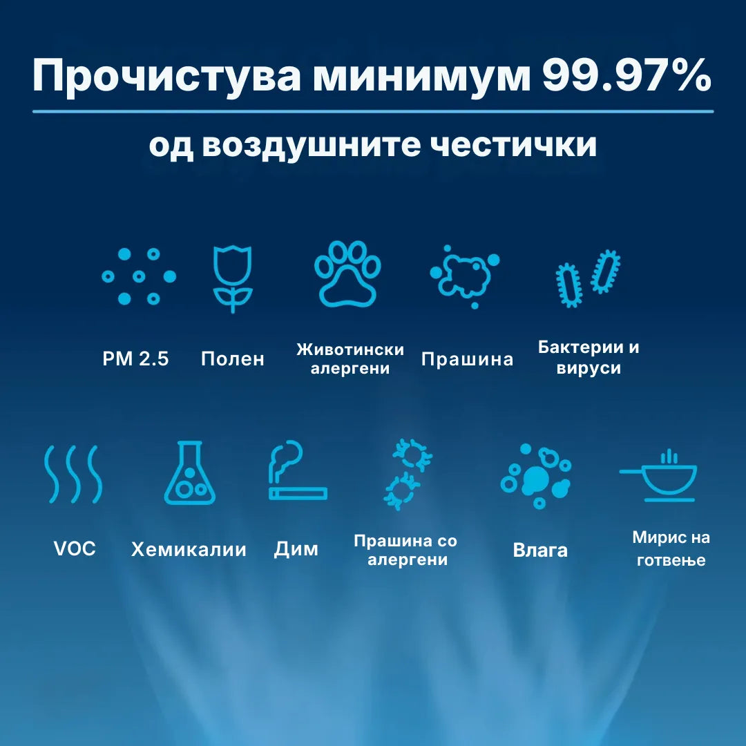 Елиминира 99.7% PM2.5 честички, 99.8% бактерии и вируси, и 88.9% формалдехид – невидливите закани што секојдневно ги дишете без да знаете.